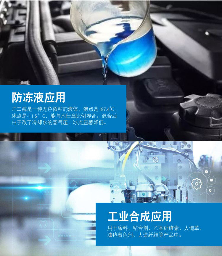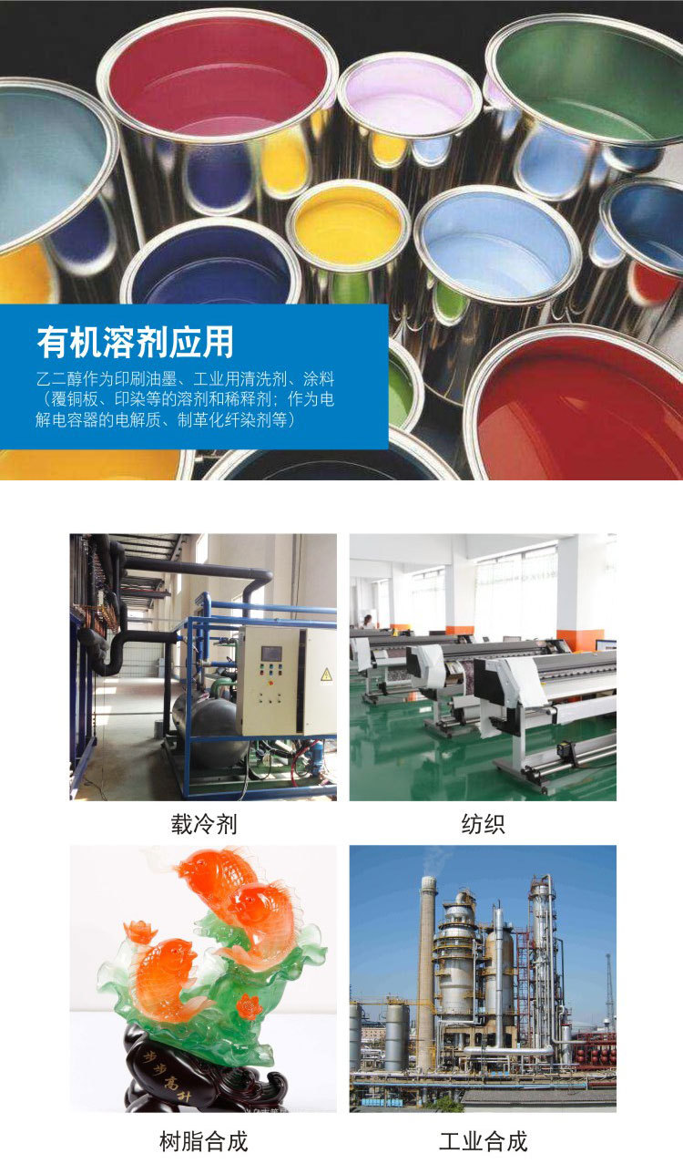 涤纶级乙二醇主要用于制聚酯涤纶,聚酯树脂、吸湿剂,增塑剂,表面活性剂,合成纤维、化妆品和 ,并用作染料、油墨等的溶剂、配制发动机的抗冻剂,气体脱水剂,制造树脂、也可用于玻璃纸、纤维、皮革、粘合剂的湿润剂。可生产合成树脂PET,纤维级PET即涤纶纤维,瓶片级PET用于制作矿泉水瓶等。还可生产醇酸树脂、乙二醛等,也用作防冻剂。除用作汽车用防冻剂外,还用于工业冷量的输送,一般称呼为载冷剂,同时,也可以与水一样用作冷凝剂。