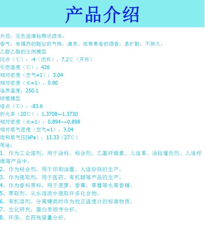 1、作为工业溶剂,用于涂料、粘合剂、乙基纤维素、人造革、油毡着色剂、人造纤维等产品中。